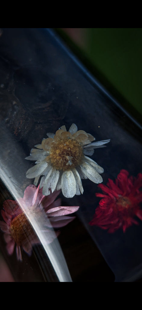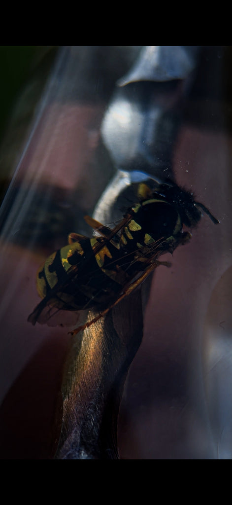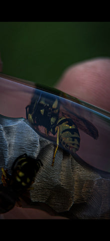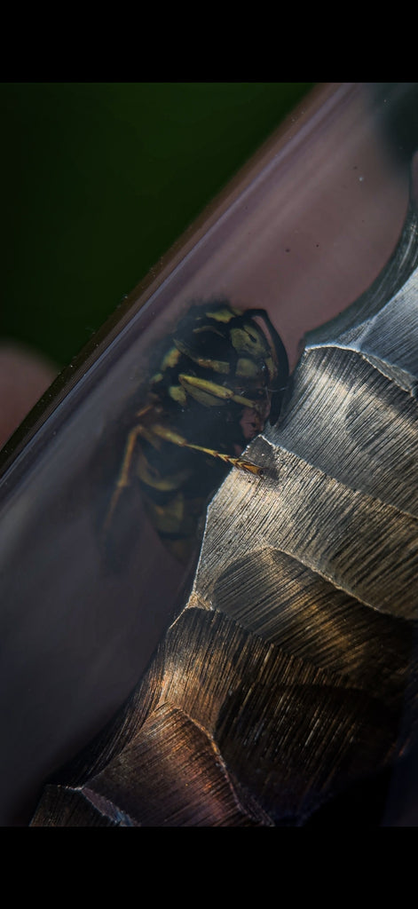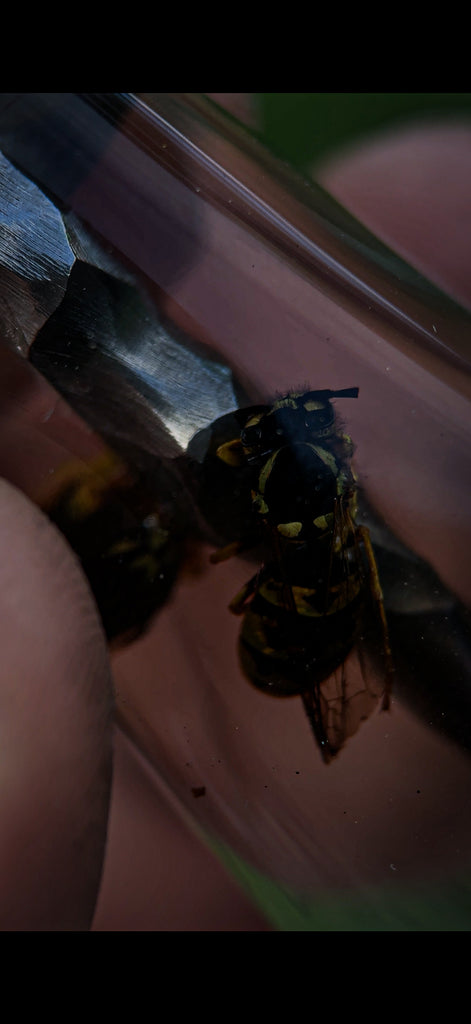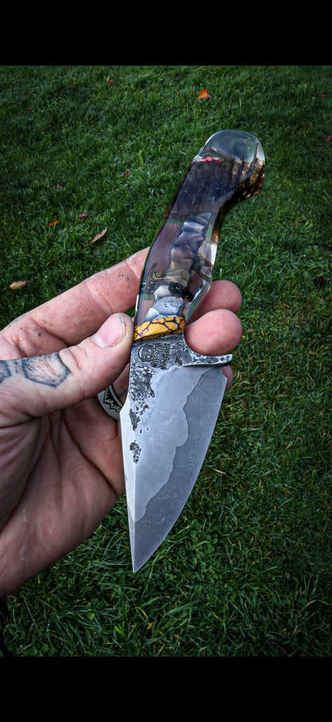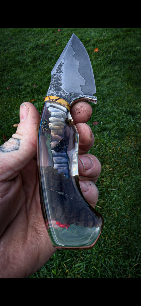 This is hand forged san mai, 80crv2 core with 15n20 cladding, it has a cutting edge of 3 1/4 in and an overall length of 7 3/4in. The handle is ridiculously gorgeous, 3 real wasps placed on a heat colored tang, with a real wasp nest in the rear, finished off with three little flowers on the nest. Absolutely one of my best builds and comes with a sheath as well.